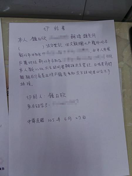 所以只好當場簽切結書,要不然還要再回醫院一趟換成正確的出生證明