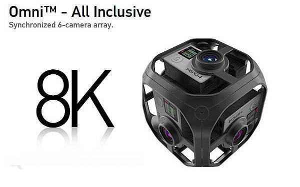 GoPro Omni 是一款可拍攝 VR360全景影像的 VR 攝錄產品組合,其套件外型如同中空的正方體,大小為 120 × 120 × 120 mm,每個平面配有一部 HERO 4 黑色版攝影機,共結合六部攝影機;附加一款小型遙控器 GoPro Smart Remote,用以同時控制六部攝影機的錄影開關。透過 Omni Importer tool 進行基礎後製時操作簡易,可調整影像色調與畫面穩定性,再輸出成 2K、4K 甚至 8K 高畫質影片,分享至 Facebook、YouTube、GoPro VR 等平台。 GoPro 官方公布全套 Omni 定價為 4,999.99 美元。官網:https://zh.shop.gopro.com/International/virtualreality/omni---all-inclusive/MHDHX-006.html