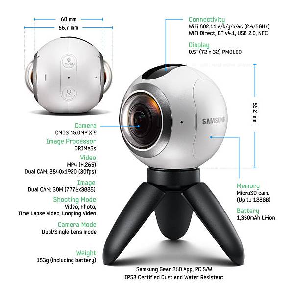 Samsung Gear 360 句有球型外觀,前後各配置了一顆 1500 萬畫素 f/2.0 大光圈鏡頭,能拍攝最高4K(3840 x 1920) 的 360 度影片,3,000 萬像素的靜態影像。機身通過IP53 的防水防塵認證,可外接最大128GB的記憶卡,電池容量則有 1350mAh。Gear 360搭載 NFC,可透過藍牙與 Wi-Fi Direct 的方式與特定的三星智慧手機( Galaxy S7 與 Galaxy S7 edge,以及 Galaxy S6 edge+、Galaxy Note 5、Galaxy S6 edge 與 Galaxy S6)相容。在攝影機底下則是直接內建了一組可拆卸的小型三腳架。連接手機 App (Samsung Gear 361 Manager)可控制或即時歡看影像,亦可以同時分享這些內容。建議售價為US$399.99元。官網:http://www.samsung.com/tw/galaxy-gear/gear-360-c200/