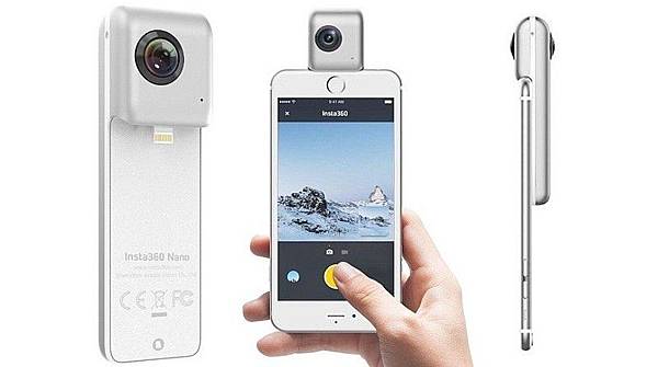 Insta360 Nano 可以算是 iPhone 專用的VR360全景相機,可兼容 iPhone 6、6 Plus。前後各有一支 210 度魚眼鏡頭,能夠拍攝出360度的無縫影片。攝錄影片的畫質可達 3K(3,040 x 1,520),電池更可連續拍片 70 分鐘,手機安裝《Insta360 Player》app,即可進行拍攝。具備一鍵分享功能,可讓用戶把影像分享到 facebook、微信等社交平台。如安裝第三方軟體《LiveKit》。就可以進行 360 度全景影像直播,還可以在手機螢幕上滑動畫面切換視點,亦可通過 VR 眼鏡來觀賞 Insta360 Nano 的拍攝影片。售價為 199.99 美元。官網:http://www.insta360.com/product/insta360-nano/
