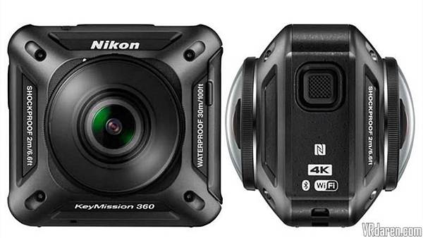 Nikon KeyMission 360 外形尺寸約為 65.7 (W) x 60.6 (H) x 61.1 (D) mm,配備 AA-15A 鏡頭保護罩。重量約為 198g ,具備前後兩顆雙鏡頭以捕捉全景視野,運用 4K UHD*5 影像攝錄的強大功能,攝錄解像度高達 3840 x 2160,透過APP進行相機設定,可直接分享YouTube 或 Facebook , JIS/IEC 8 級防護 (IPX8)能夠在深至 30 米/100 尺 的水底長達 60 分鐘,高達 2.0 m 的防震高度,-10°C 防凍溫度 及防塵,售價為500美元。官網:https://www.nikonusa.com/en/nikon-products/action-cameras/index.page