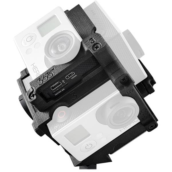 Freedom360 GoPro Mount 是專屬於 GoPro 的VR360全景相機架,可以自行決定搭載 6 個 hero4 或 hero3+/hero3(黑色和銀色),可以將6個鏡頭拍攝的畫面縫製成360度視頻,沒有最低盲點。搭配自家影片合成軟體,可以快速簡單的將影片輸出成VR360全景影片,這也是目前最多人使用的配件之一。售價500-1300美元。官網:http://freedom360.us/shop/freedom360classic/