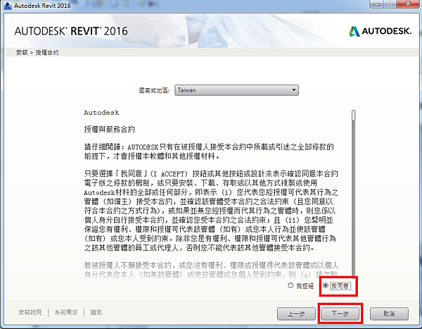 2. 點擊「我同意」,再點擊右下角的「下一步」準備開始安裝 Revit 2016。