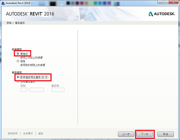 3. 授權類型選「單機板」,產品資訊選「我希望試用此產品30天」(如果有正版序號,可在此輸入),再點擊右下角的「下一步」準備開始安裝 Revit 2016。