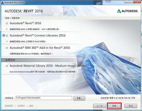 1. 執行 Revit 2016 安裝程式,點擊「安裝」準備開始安裝 Revit 2016。